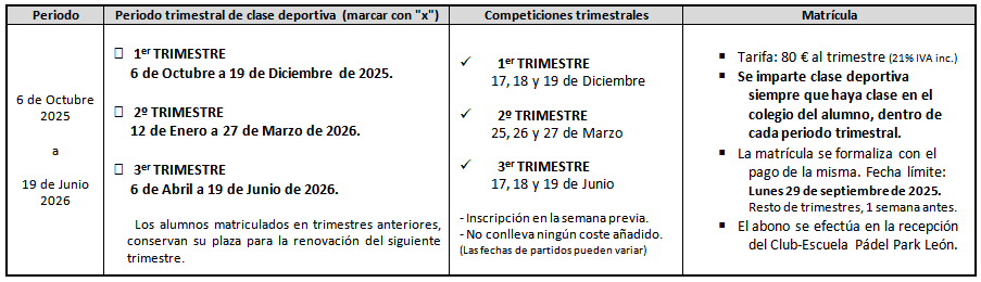 Las matrículas son trimestrales y se formalizan a partir del lunes 22 de Septiembre de 2025 en el propio Club-Escuela Pádel Park León para el primer trimestre del curso.