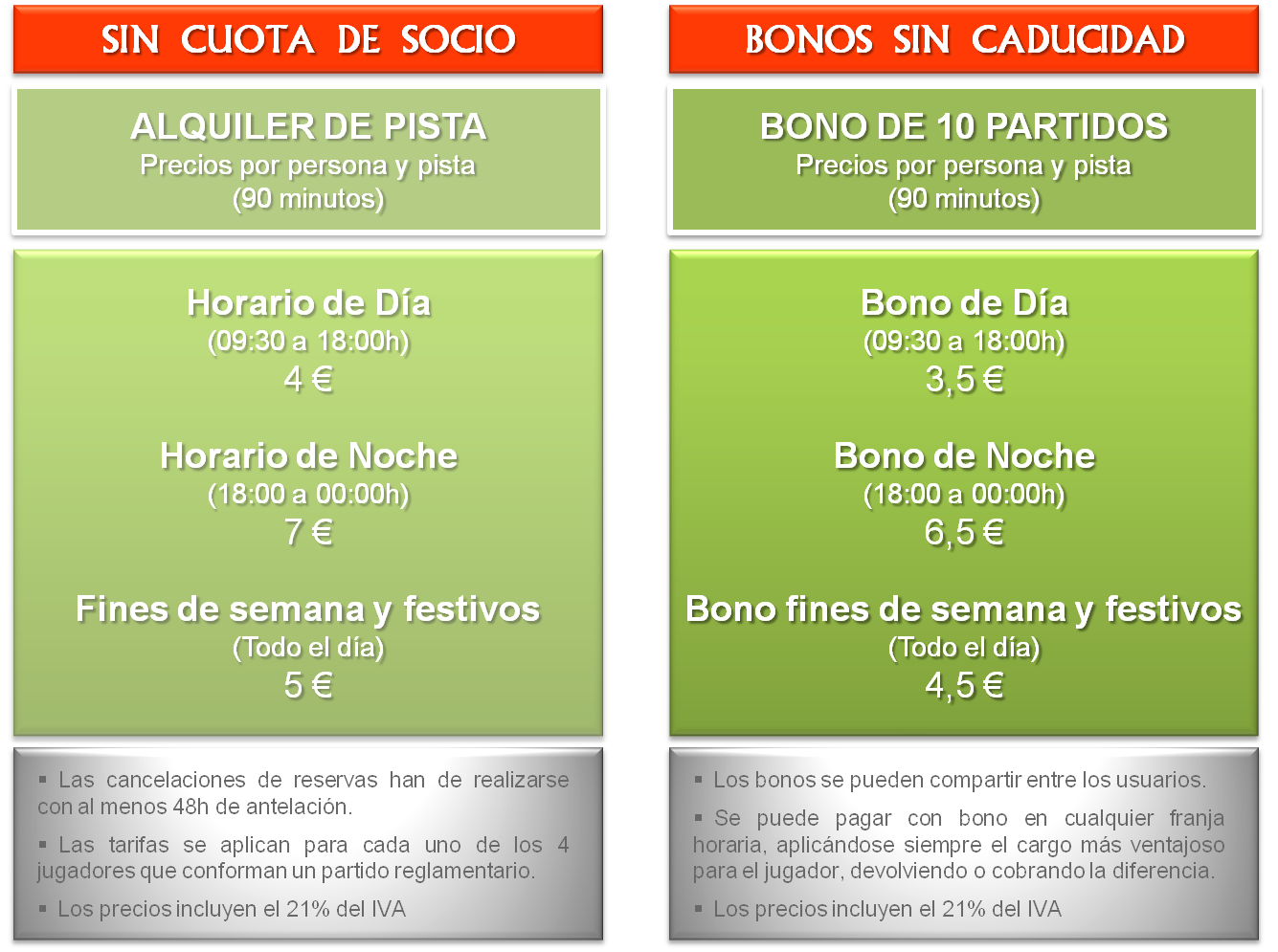 Tarifas para el alquiler de pistas